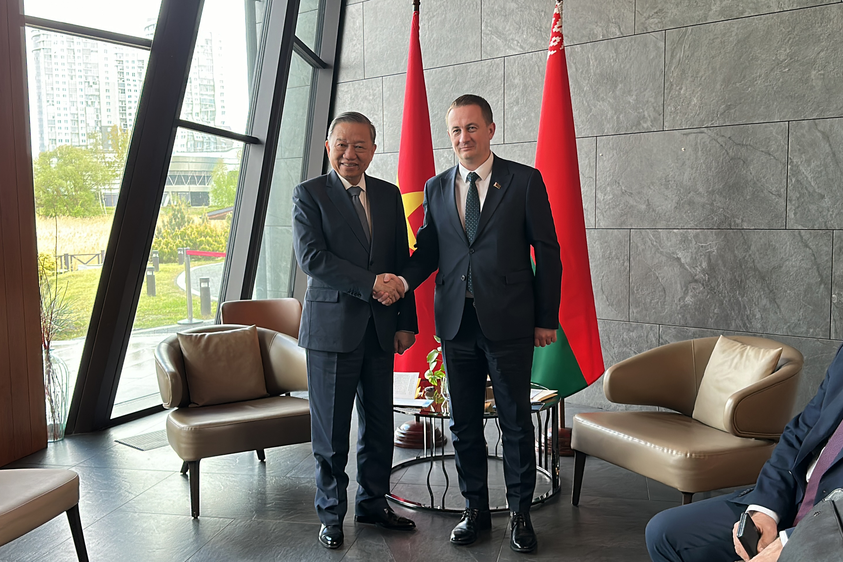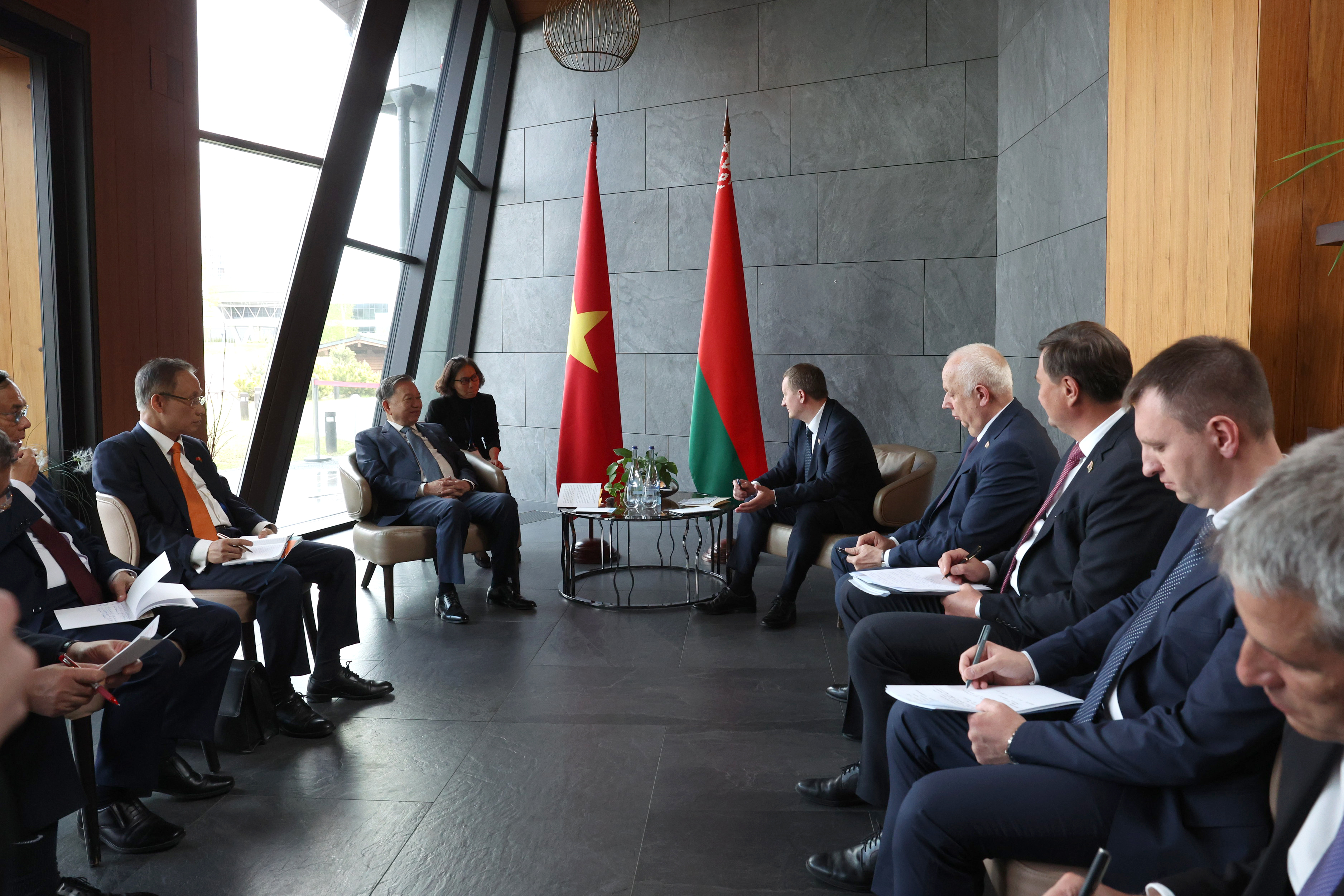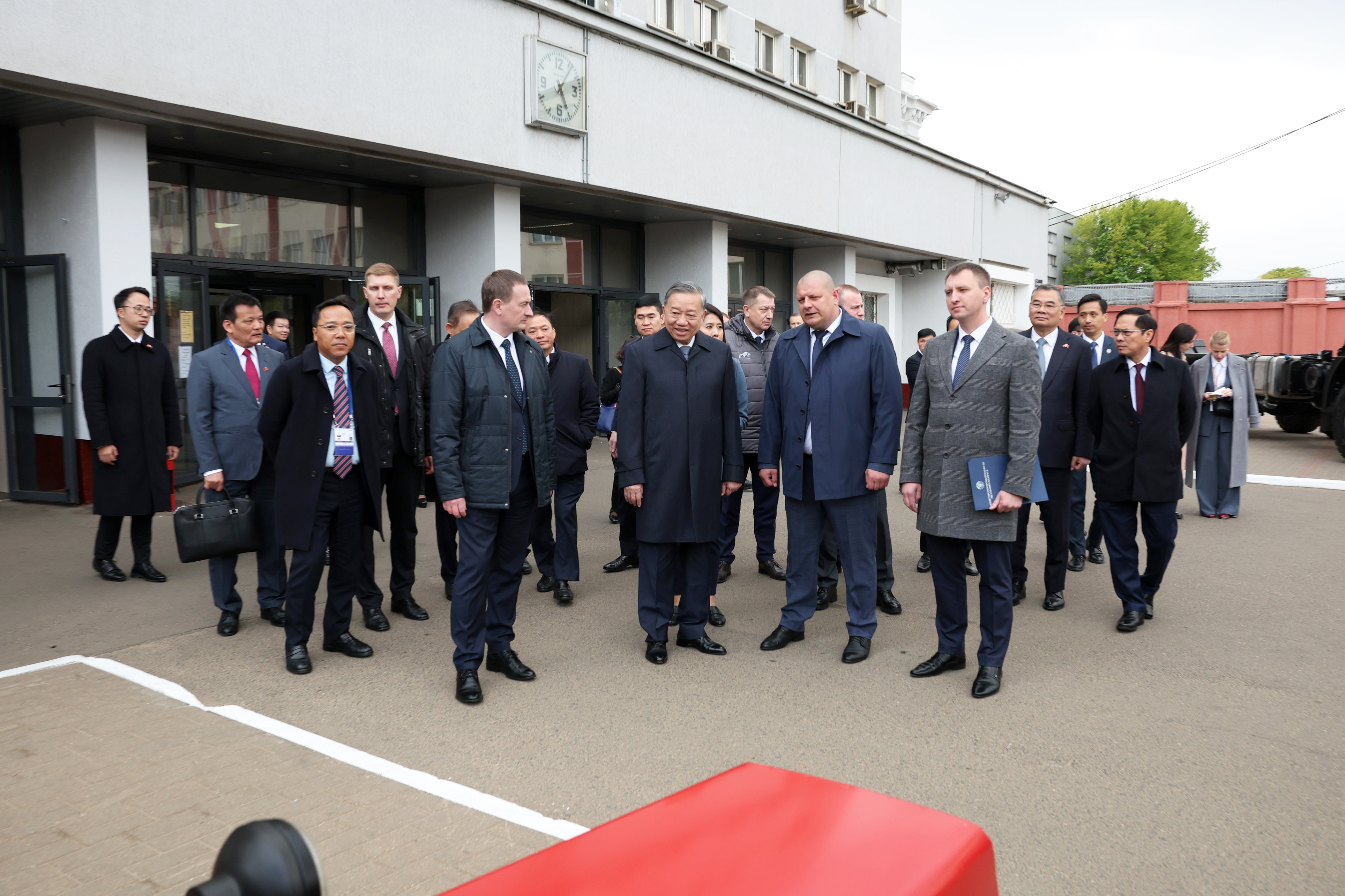 Александр Турчин отметил, что перспективным направлением развития сотрудничества с Вьетнамом могут стать пожарные машины, и предложил ознакомиться с одним из таких производств в Беларуси. То Лам предложение принял, отметив, что в Беларуси очень развито машиностроение и грузоподъемность машин впечатляет.